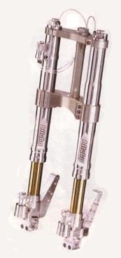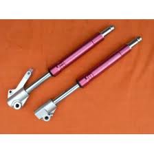 A veces se tiene la barra de suspension delantera picada por un piedra,o simplemente se la quiere cambiar. Suponiendo que sea una suspensión estandard, no horquilla invertida para la que utilizamos herramienta específica, se comienza por asentar bien la moto, y se la levanta por la parte baja de la tija delantera dejando la rueda delantera y la suspensión libres al aire. No se debe vencer la moto por ningún lado. Entonces se desmonta la rueda delantera; para ello se sueltan las dos pinzas de freno con sus soportes y se aseguran a cualquier parte de la moto, que no queden colgando los latiguillos de freno y no se rompan a la vez para que no molesten a la hora de trabajar en las barras.